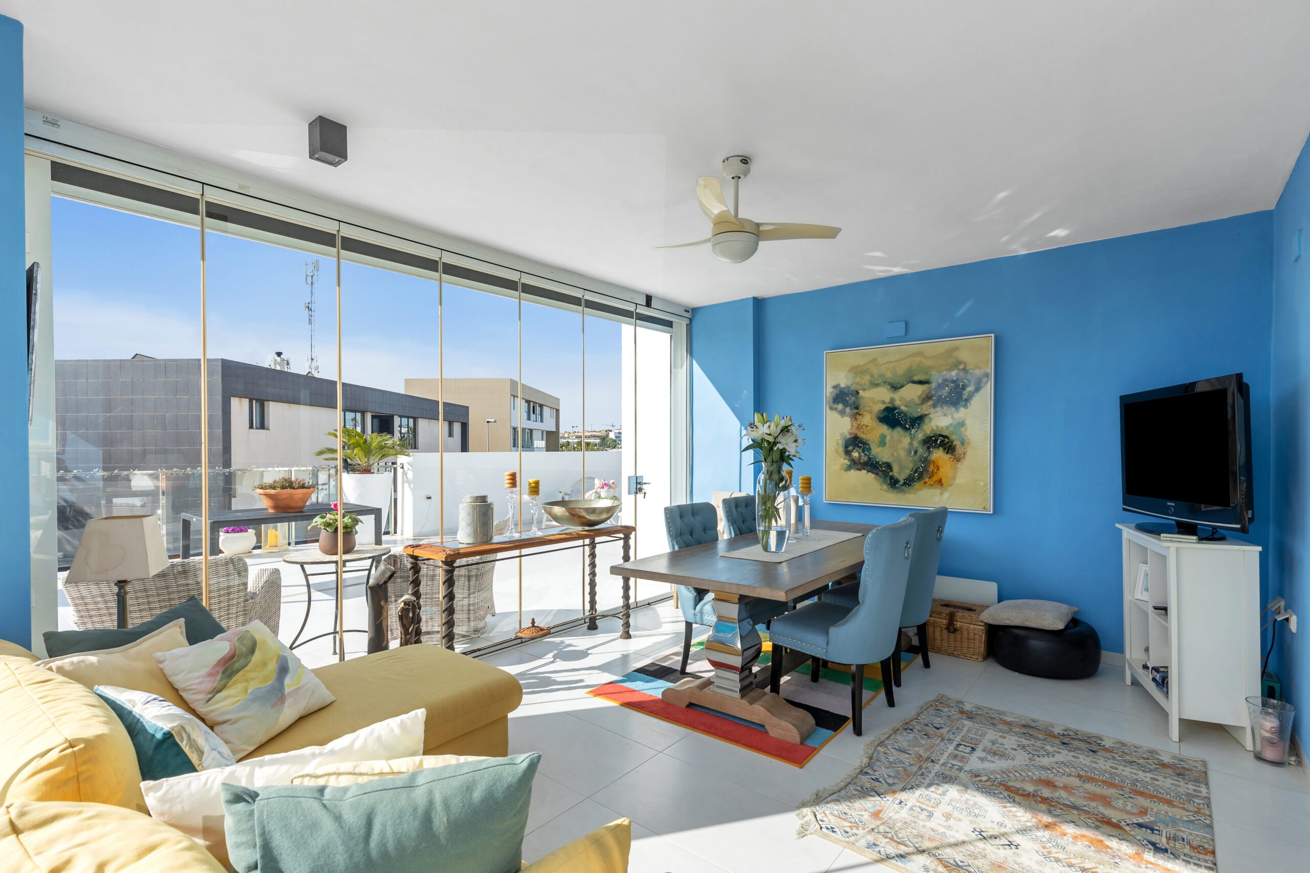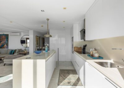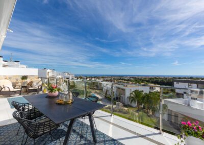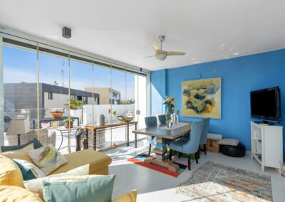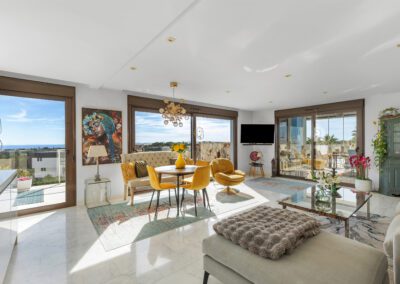 Denne penthouse leiligheten har 2 soverom og 2 bad. Det tredje soverommet er i dag en vakker vinterhage, men kan med enkle grep bli det tredje soverommet. Her kan man boltre seg under solen på 250 m2 fordelt på terrasser og takterrasse – med fantastisk utsikt.