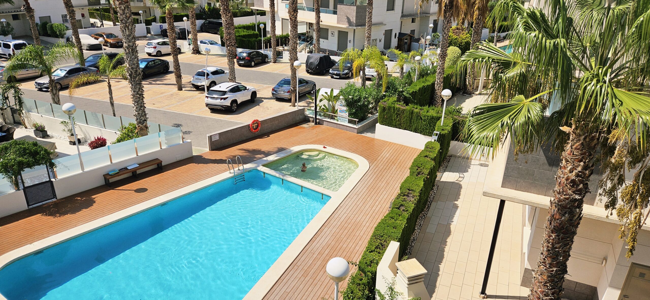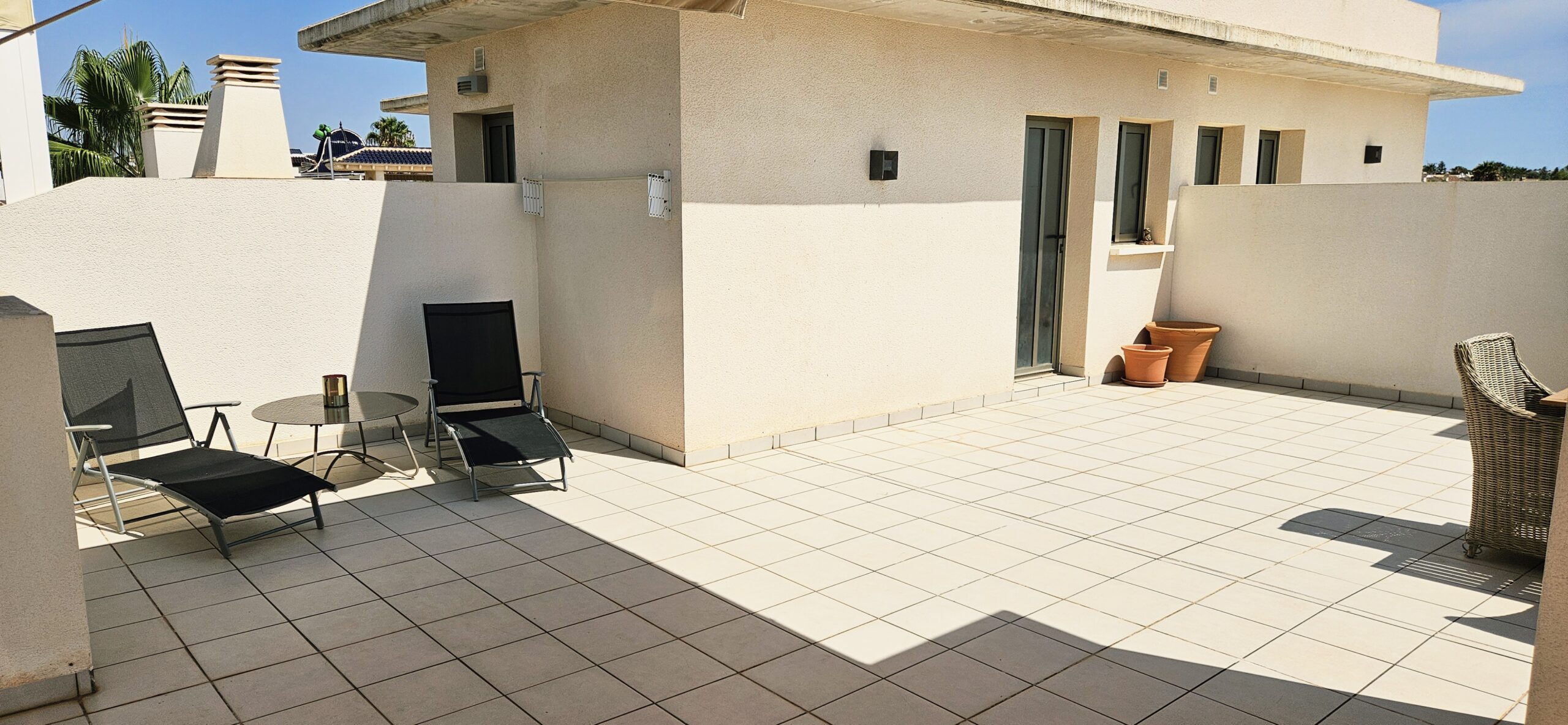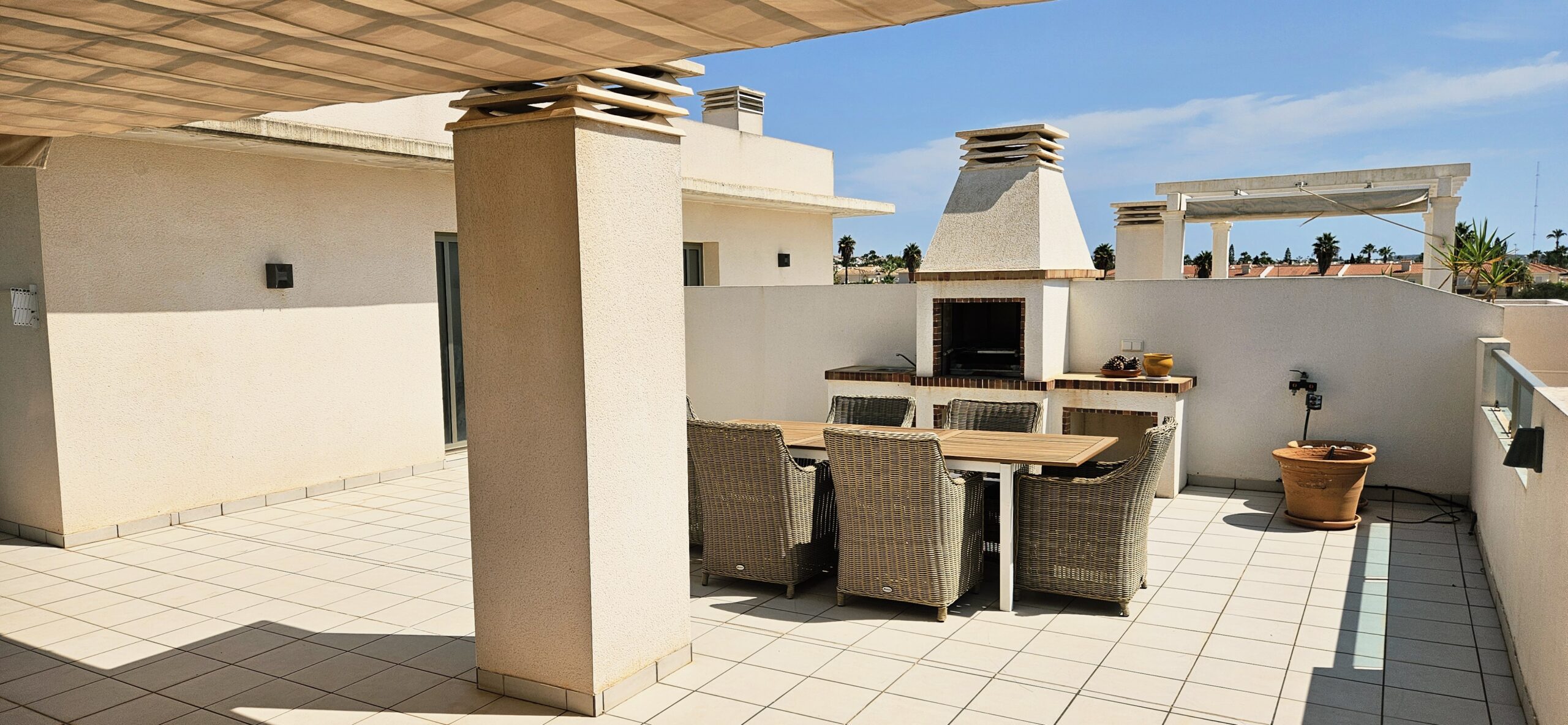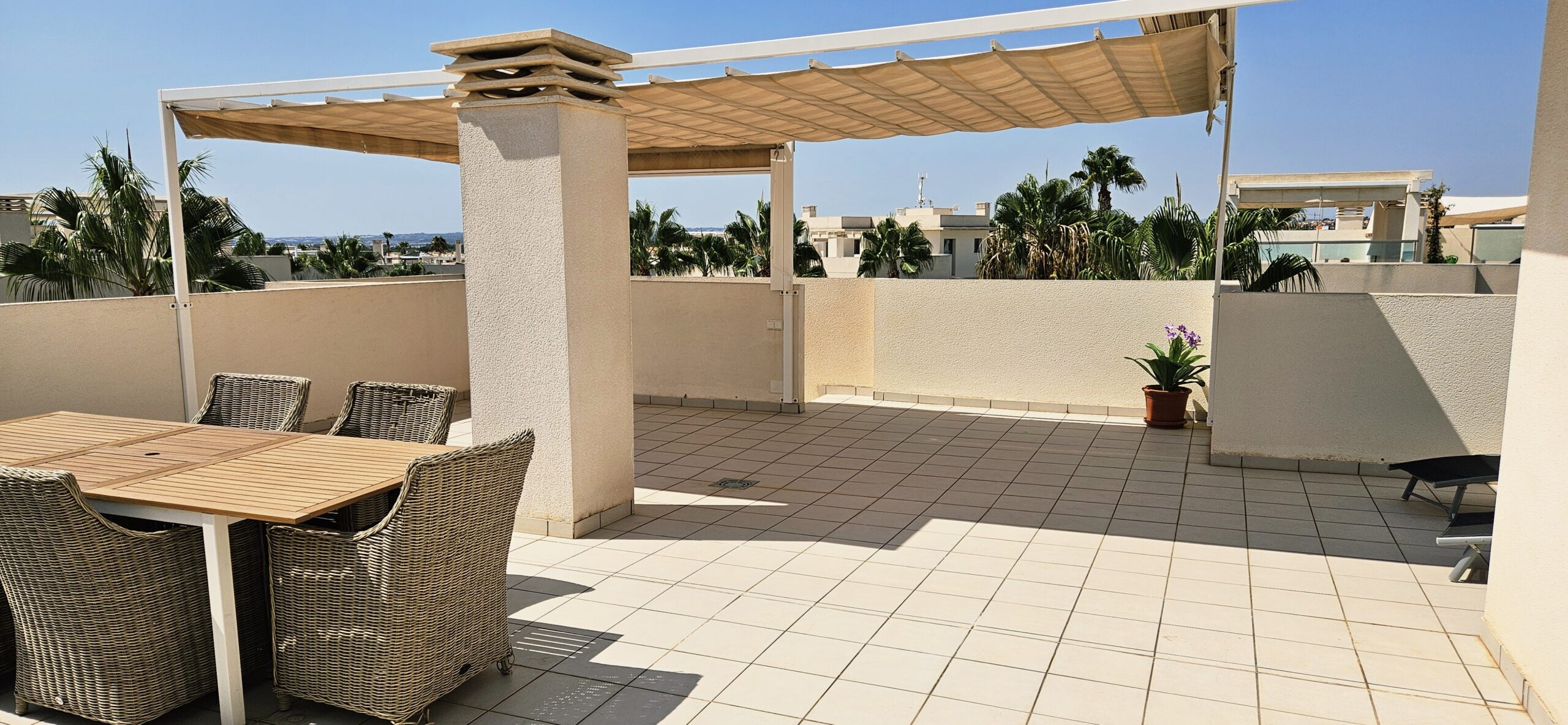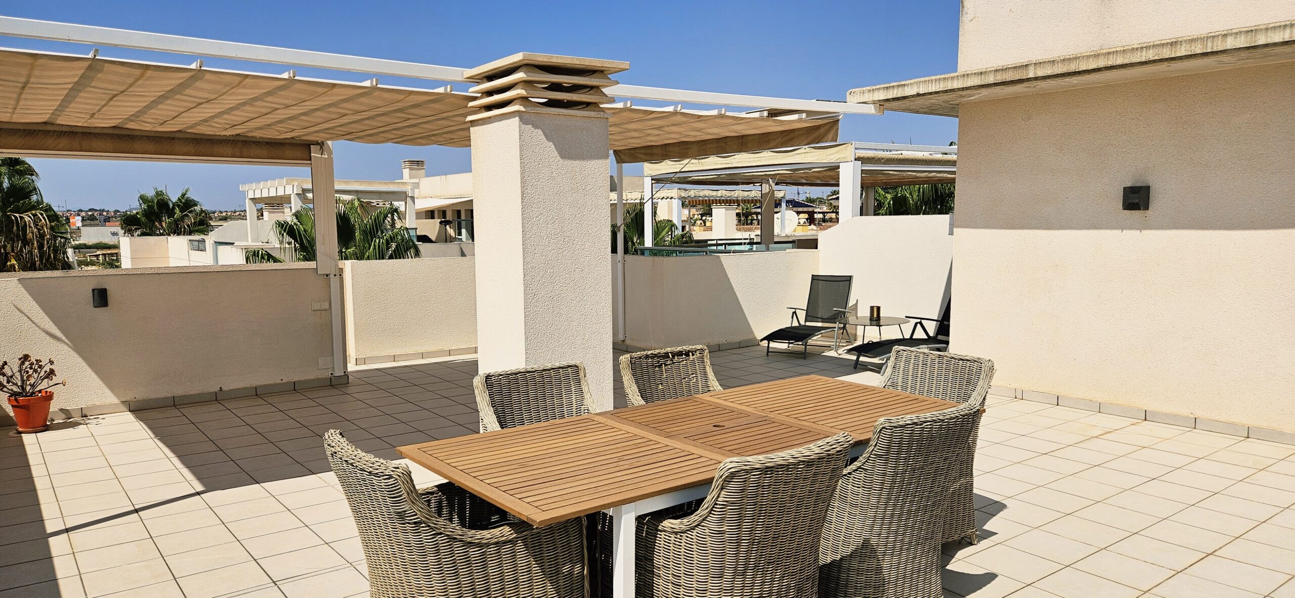 Flott penthouse leilighet med 3 soverom, 2 bad, terrasse utenfor stuen, og en stor takterrasse med utegrill. Ligger sørvendt. Komplekset har totalt 4 felles svømmebasseng.