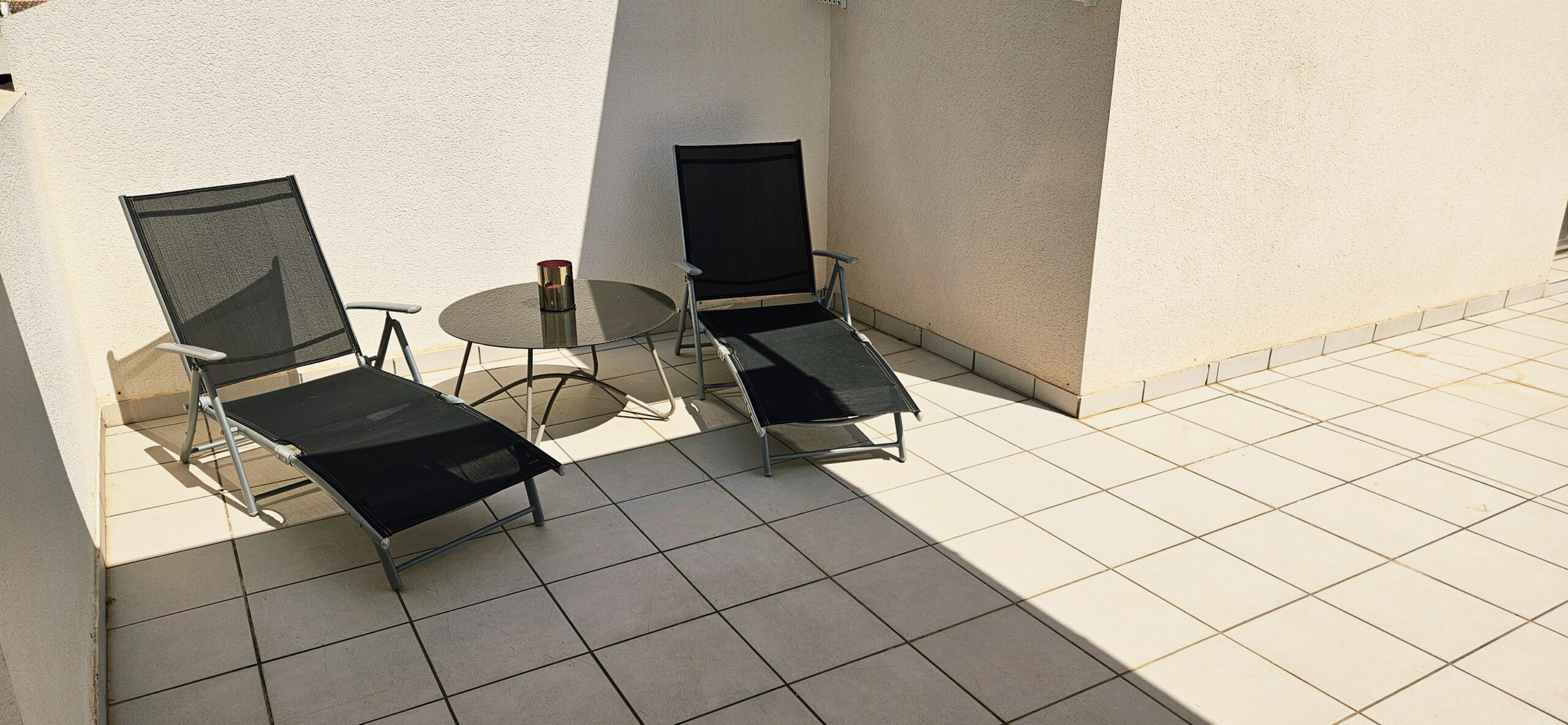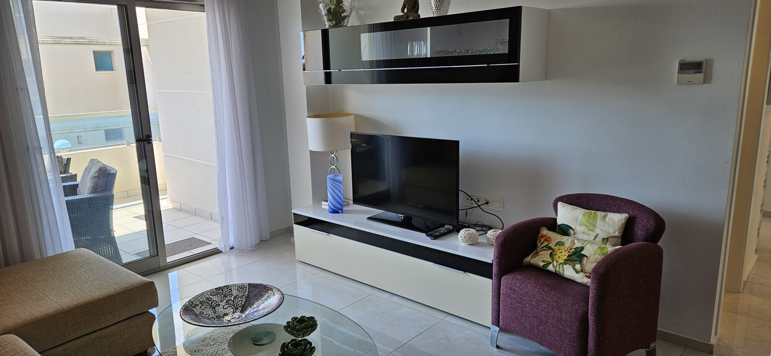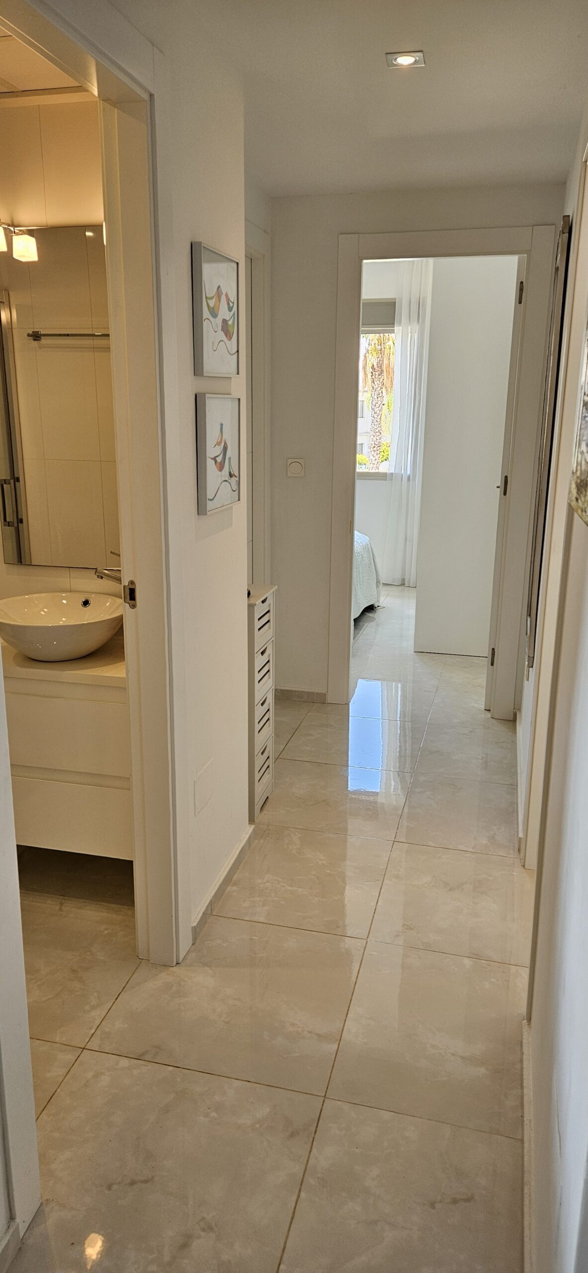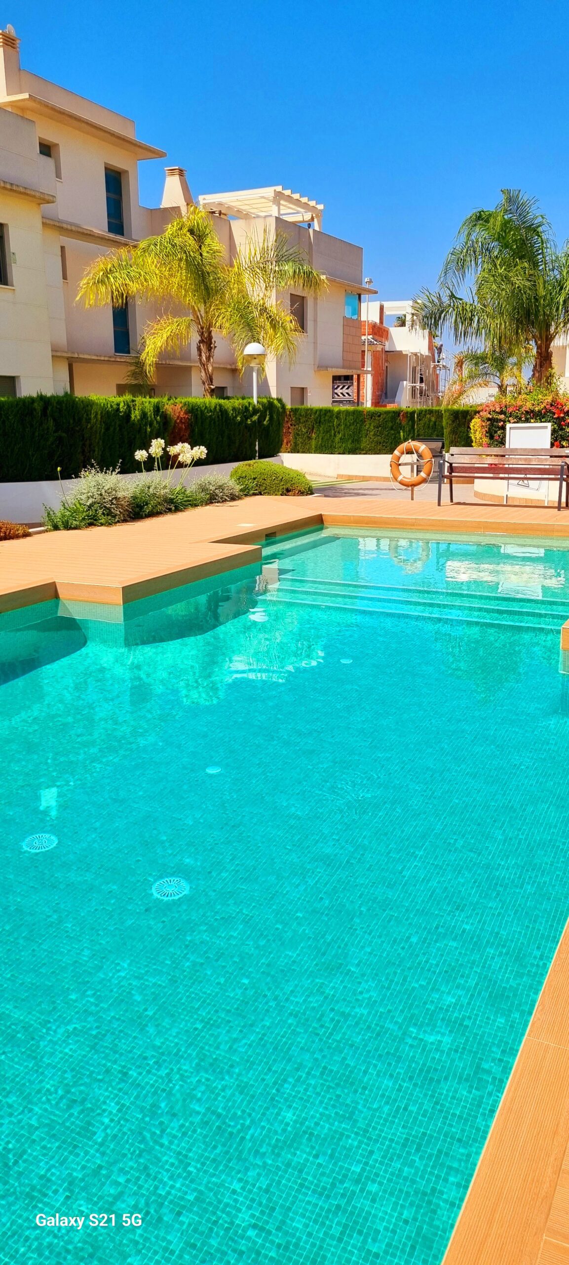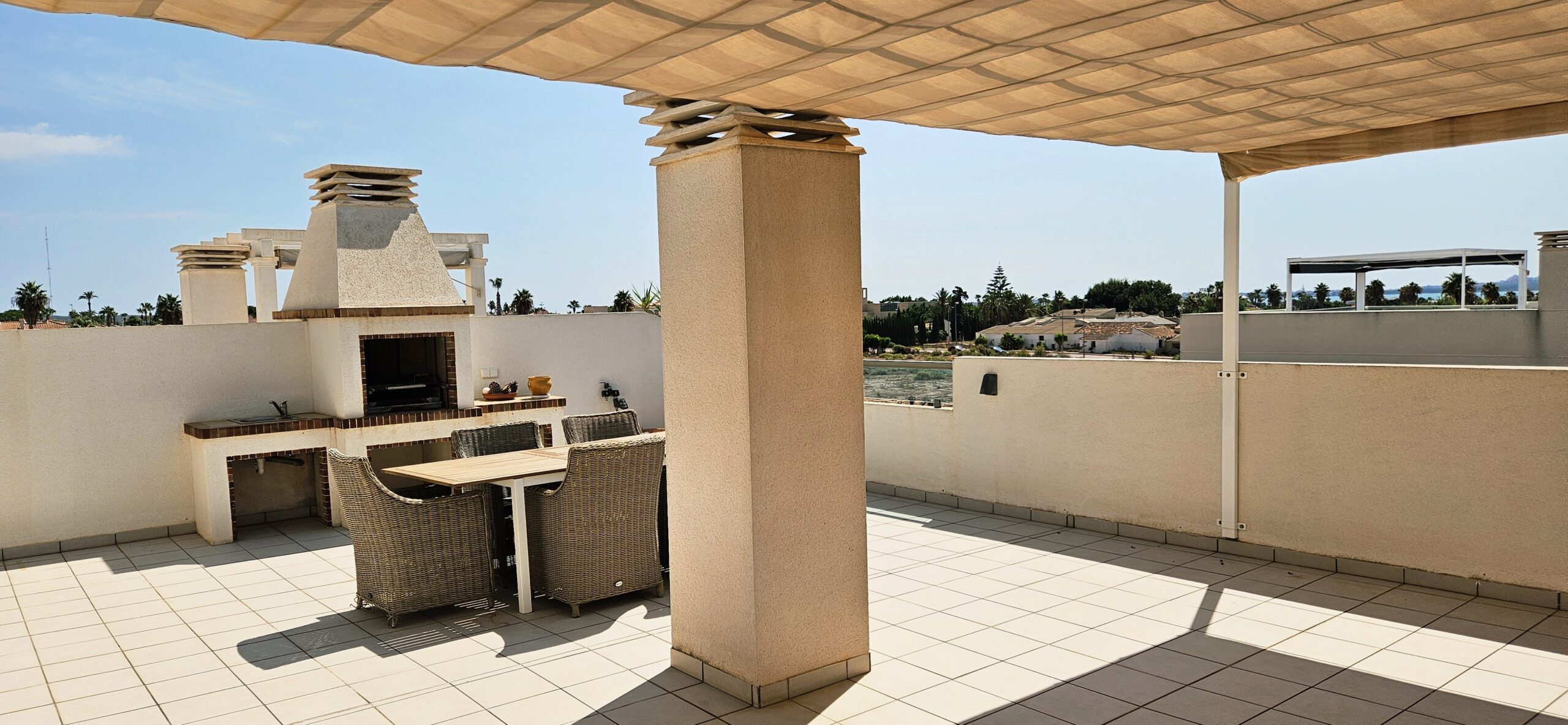Flott penthouse leilighet med 3 soverom, 2 bad, terrasse utenfor stuen, og en stor takterrasse med utegrill. Ligger sørvendt. Komplekset har totalt 4 felles svømmebasseng.